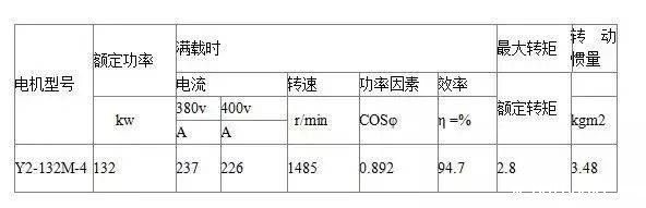 马达额定功率(额定输出功率或额定轴功率): P = 132kw;马达效率(以华达电机举例): = 94.7%;功率因子:COSφ=0.892;服务系数S.F=1.15 (也有厂家采用的服务系数S.F=1.2)。