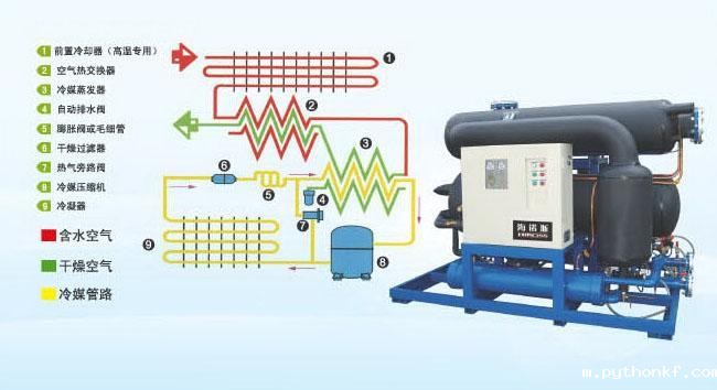 压缩空气流程:压缩空气→机械过滤器→换热器(放出热量)→蒸发器→气液分离器→换热器(吸收热量)→出口机械过滤器→储气罐