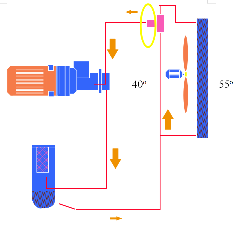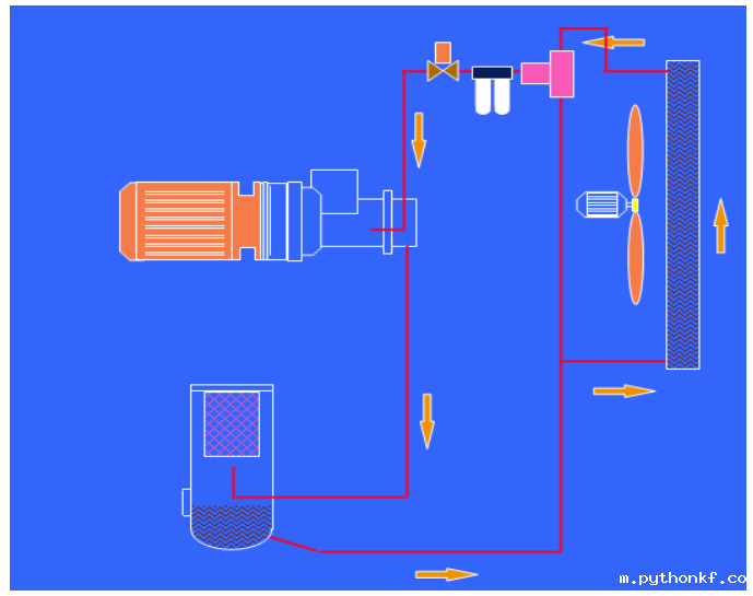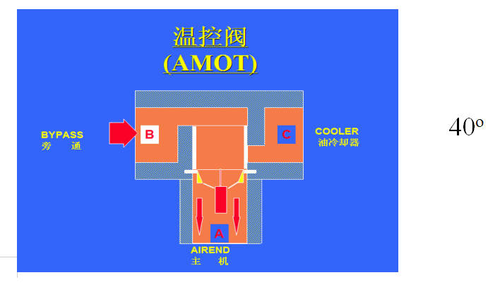 风冷式冷却系统:冷却系统包括空气冷却器和油冷却器,它们都是通过电机上带的风扇冷却的。油冷却器为前冷却器用于冷却油,后冷却器用于冷却压缩空气。喷油系统上装有一个,当油温低于40℃时,油不经冷却器直接进入机体。当油温超过55℃时,该阀关闭使所有的油通过油冷却器冷却后再进入主机。