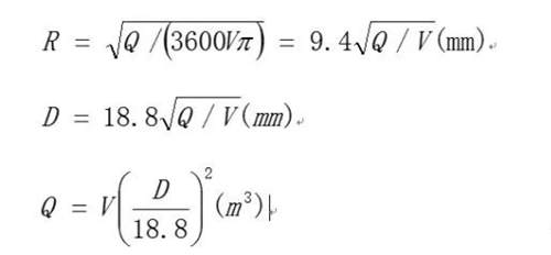 Q=VπR2 x 3600式中,Q: 工况流量— m³,V: 介质流速— m/s,R: 管道半径 — m