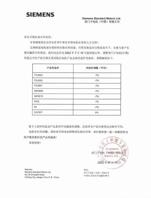 近日,西门子电机(中国)有限公司发布调价通知,由于部分原材料价格有所回落,西门子贝得电机全系列低压电机产品以及相关选件迎来价格下调,降价幅度达7%,自2022年7月16日开始执行。据了解,此次西门子降价的具体型号为1TL0003\0303\0001,1MT0003\0013,YVF2,YD等。