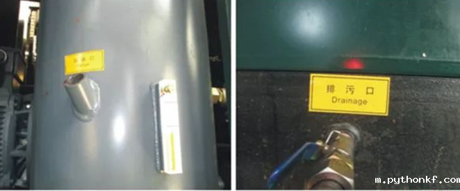现场如有压缩空气,可将压缩空气接到机头上方进气管道一个阀门出。利用压缩空气压力,将系统中的旧油快速排空及进行吹扫。将软管一头接到油气罐排污阀,一头接到废油桶,打开阀门,放空油气罐旧油。在确保安全的情况下,尽可能在热机状态下放油。