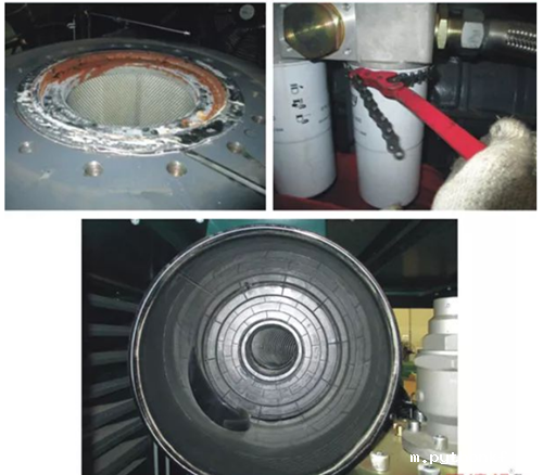 拆除油分离器管路,打开油气分离器,取出油分芯。拆除旧的油滤。更换旧的空滤芯,并对空滤进行清理。