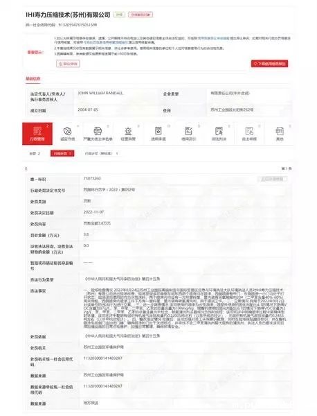 2022年11月7日,苏州工业园区环境保护局作出苏园环行罚字﹝2022﹞第092号处罚决定书。信用中国(江苏苏州)官网载明:IHI寿力压缩技术(苏州)有限公司违反《中华人民共和国大气污染防治法》第四十五条,罚款3.8万元。