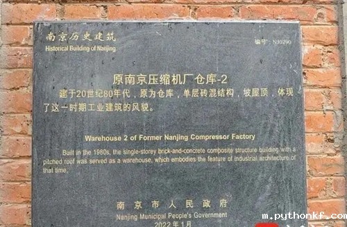 记者在现场看到,厂区内有3幢外形相似、结构基本相同的厂房,在其中一座厂房的大门上贴有一块“南京历史建筑”的标识,相当于它的“身份证”,上面标明为“原南京压缩机厂仓库-2”,并介绍说其建于20世纪80年代,为单层砖混结构,坡屋顶,体现了这一时期工业建筑的风貌。
