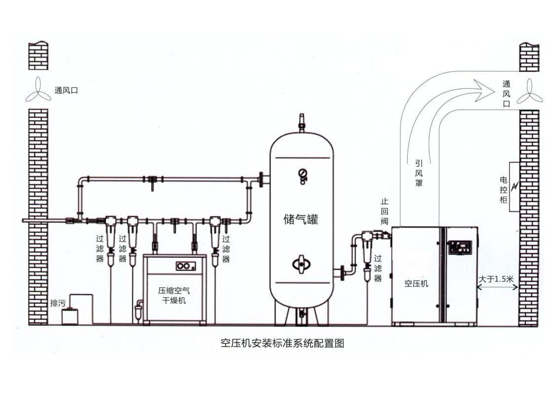 空压机与后处理设备的间距:冷干机、储气罐等后处理设备应与空压机保持1-1.5米的距离,确保气流畅通。