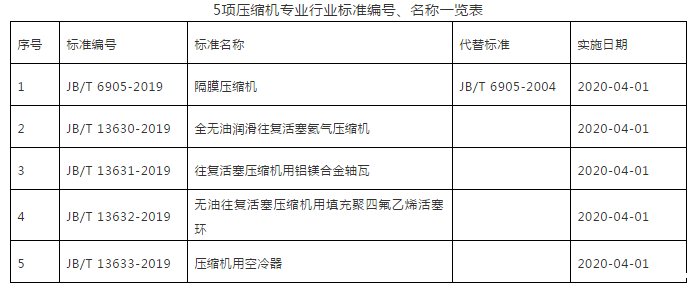 2019年第29号中华人民共和国工业和信息化部公告,由中华人民共和国工业和信息化部批准发布了5项压缩机专业国家标准,具体标准名称、标准编号及实施日期如下: