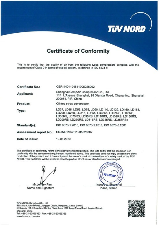 2020年6月10日,国际独立第三方检测、检验和认证机构德国莱茵TÜV集团为上海康普艾压缩机有限公司和佶缔纳士机械有限公司的无油螺杆空压机颁发了ISO8573认证(压缩空气质量管理体系),无油级别达到了“Class 0”要求。