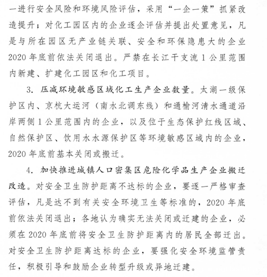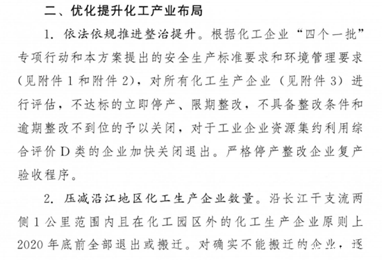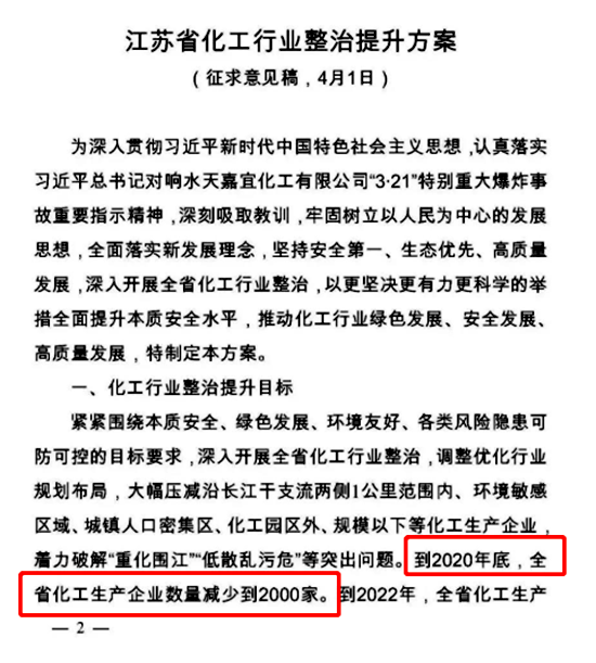 但在2019年的4月27日,江苏省人民政府办公厅正式印发《江苏省化工产业安全环保整治提升方案》,方案删除了削减化工企业数量的数字,但依然明确提出要关闭安全和环保不达标、风险隐患突出的化工生产企业。