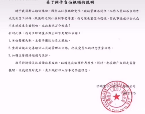 与员工回应相反,这次他们承认了这件事,但认为这件事是“招工旺季场地受限导致的,现场管理不到位”导致的。