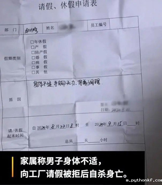 近日,广东一男子身体不舒服向工厂请假,工厂拒绝了请假的诉求,自杀身亡,警方已介入调查。