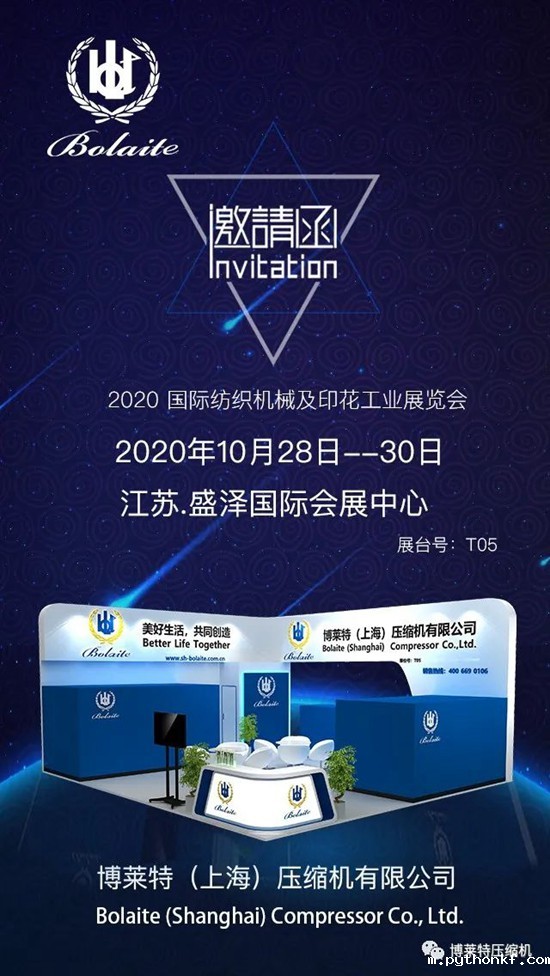 博莱特携全新3bar和5bar低压空气压缩机参加中国(盛泽)国际纺织机械及印花工业展览会!诚邀莅临!