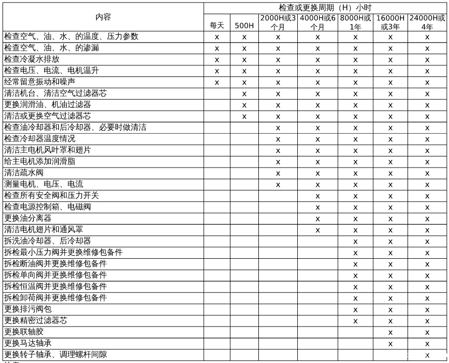 注意:为了使空压机能够正常可靠的运行,保证机组的使用寿命,续制定详细的维护计划,执行定人操作、定期检查保养、使空压机组保持清洁、无油、无污垢。