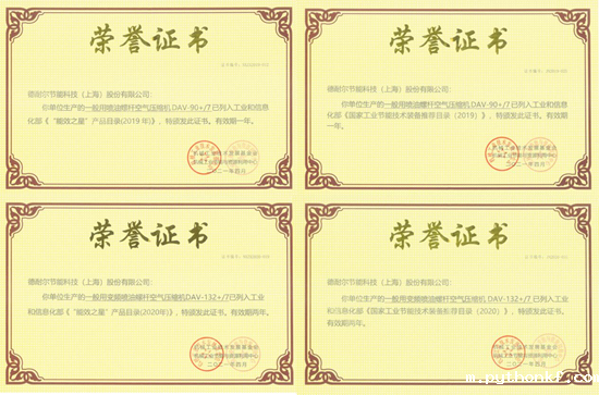 会议发布了2020年《国家工业节能技术装备推荐目录》及《“能效之星”产品目录》入围企业名单,并为2019、2020年入围企业发放能效标识及相关证书,德耐尔节能科技(上海)股份有限公司生产的一般用喷油螺杆空气压缩机DAV-90+/7、一般用变频喷油螺杆空气压缩机DAV-132+/7双双入围。