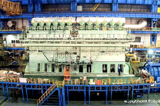 23000标准集装箱船的超级动力心脏,世界上最大的船用内燃发动机,也是23000标准集装箱船的超级动力心脏。 占地面积接近一个标准篮球场,高达16米,相当于五层楼高。重量超过2000吨,相当于10台波音747飞机的重量,输出功率高达63800千瓦,比200辆重型卡车的动力还要强劲。