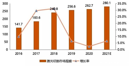 激光切割设备在智能装备制造环节中必不可少,也是中国制造走向高端化、智能化的关键角色之一。目前激光切割技术的新市场朝着超高精度作业领域发展,激光切割的切口宽窄度和切口表面粗糙度等控制精度更高。根据《2021中国激光产业发展报告》显示,2020年预计激光切割市场规模(含钣金切割、精密切割、其他非金属材料切割等)达到263亿元,同比增长2.4%,预计2021年总体市场规模达将超300亿元。