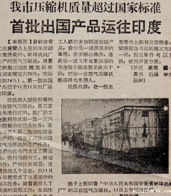 当年,蚌埠生产的空气压缩机,不仅远销国内,而且以精良的质量标准,完全达到出国水平。1958年全厂职工在胜利的欢笑声中,把三台W/3m³型的移动式空气压缩机运往印度尼西亚,开创了蚌埠机械工业的光辉篇章。同时,填补了我国机械工业的空白,为我国的冶金、石油、化工以及国防工程建设了做出了贡献!