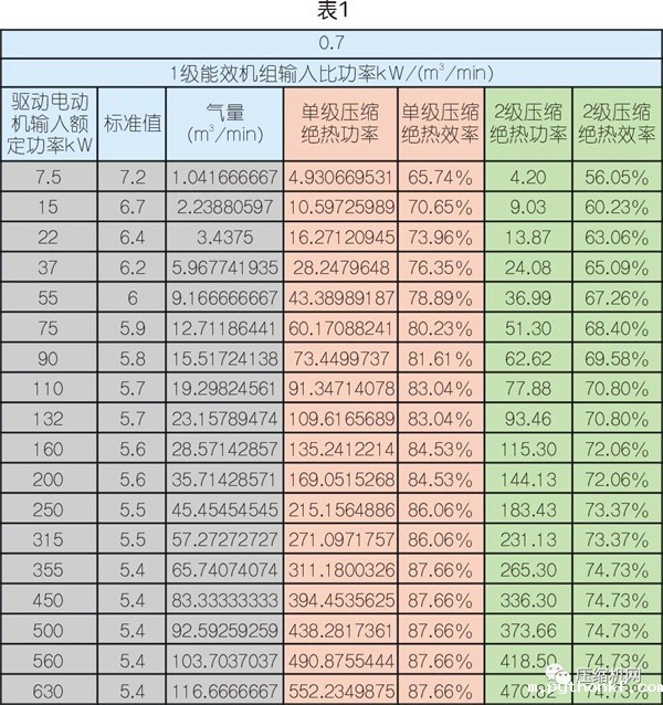 本文主要从喷油螺杆空压机对1级能效限定值的绝热效率需求值去分析主机对空压机节能的影响,并运用绝热效率来揭示单级压缩和两级压缩节能的秘密。