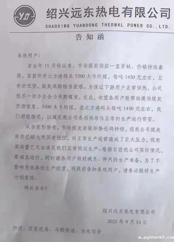 山东:全省因煤炭供应不足,电力紧张,启动限电措施。青海:发布限电预警,限电范围继续扩大。