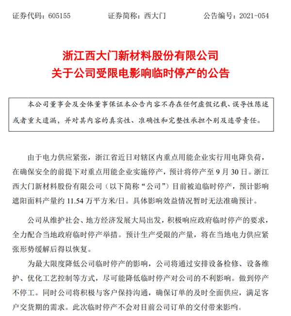 西大门22日晚间公告称,由于电力供应紧张,浙江省近日对辖区内重点用能企业实行用电降负荷,在确保安全的前提下对重点用能企业实施停产,预计将停产至9月30日。浙江西大门新材料股份有限公司目前被迫临时停产,预计影响遮阳面料产量约11.54万平方米/日。具体影响效益情况暂时无法准确预计。