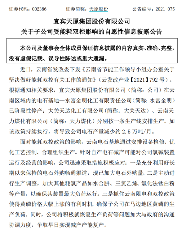 天原股份也发布公告表示,近日,云南省发改委下发《云南省节能工作领导小组办公室关于坚决做好能耗双控有关工作的通知》。根据通知相关要求,公司在云南区域内的电石基地--水富金明化工有限责任公司已阶段性停产;大关天达化工有限公司、云南天力煤化有限公司分别按一条生产线安排生产。如该政策持续执行,将导致公司电石产量减少约2.5万吨/月。