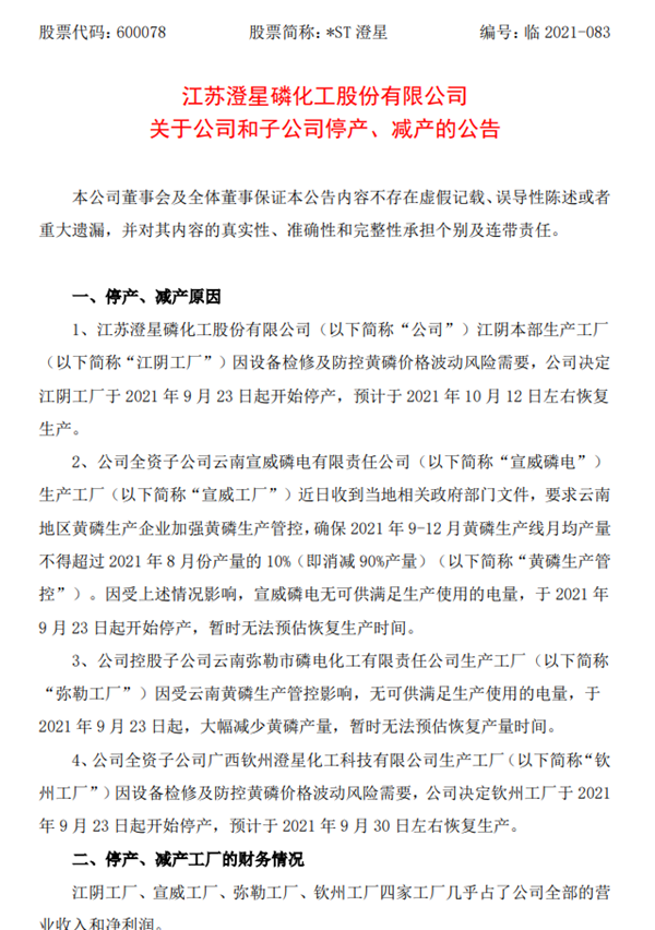 *ST澄星9月22日晚间公告称,受黄磷生产管控影响,其中云南两家子公司更是无可供满足生产使用的电量,公司决定子公司江阴工厂、宣威工厂、弥勒工厂、钦州工厂等四家工厂于9月23日起开始停产,上述四家工厂几乎贡献了公司全部的营业收入和净利润。