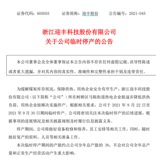 22日晚间,迎丰股份发布公告称,为缓解煤炭库存状况,保障供热、用热企业安全有序生产,公司于9月22-23日临时停产。