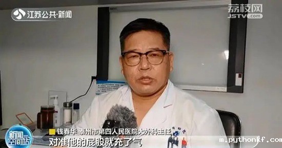 泰州市第四人民医院大外科主任钱春华:“他的话,是在上班的时候同事开玩笑,用这个充气泵(高压气枪)对准他的屁股充了气,导致病人的直肠乙状结肠破裂。”