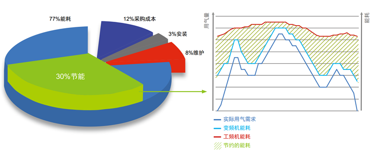 ---以5年的时间为例,压缩机的能耗成本占总运行成本约70%,这正是将节能的主要关注点放在降低压缩机本身能耗成本上的主要原因。