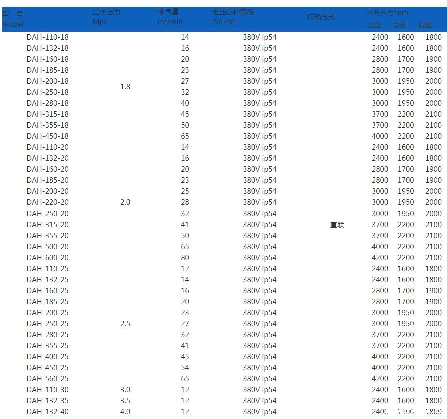 4、高排气压力可达4.0MPa(abs),排气范围是14-80m³/min;